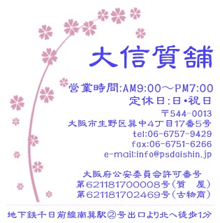 身分証明書を持参の上ご来店ください。 お送りいただく場合は「住民票の写し等の原本」(初回のみ必要。コピー不可) ・身分証明書のコピーを添えて着払いにて下記宛先までお送りください。 〒544-0013 大阪市生野区巽中4-17-5 有限会社大信質舗 担当:濱畑(ハマハタ)宛て TEL: 06-6757-9429 FAX: 06-6751-6266 E-mail: info@psdaishin.jp ※ご来店いただける場合、「住民票の写し等の原本」は不要です。 | ||